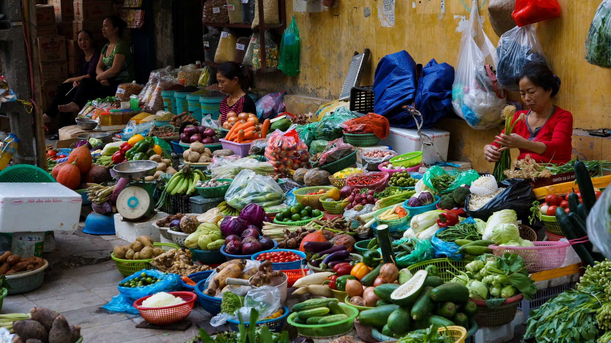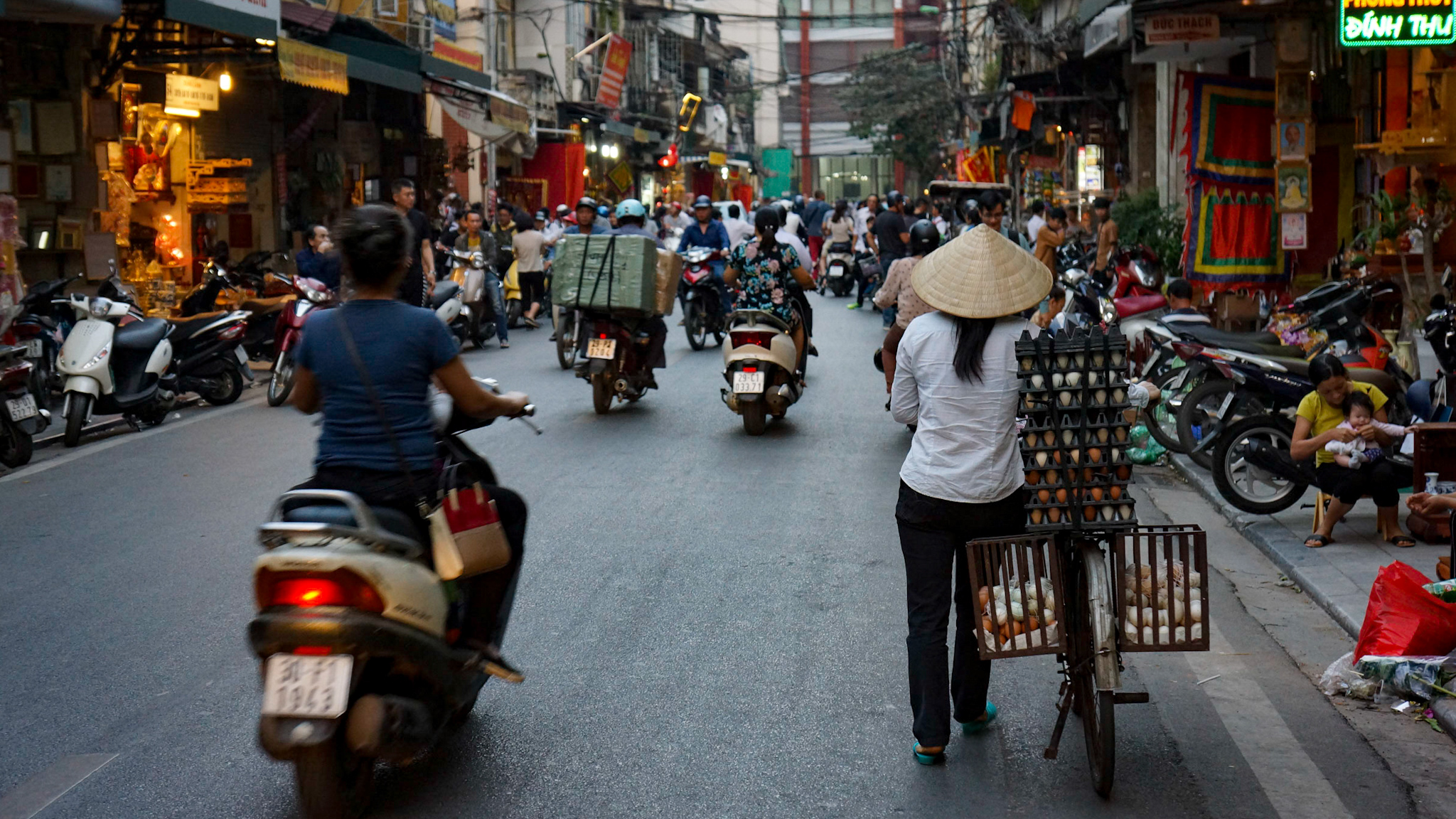 Une bonne douche pour oublier le jetlag et nous voici déjà dans les rues animées du vieux quartier de la capitale. Chaque rue est une accumulation plus ou moins ordonnée de boutiques spécialisées: ici les ferrailleurs, là les chaussures, puis les herboristes, et ainsi de suite. Cette juxtaposition tellement asiatique n’est pas pour me déplaire, mais le klaxon omniprésent des scooters qui se faufilent dans le moindre espace libre contraint à un attention de chaque instant.