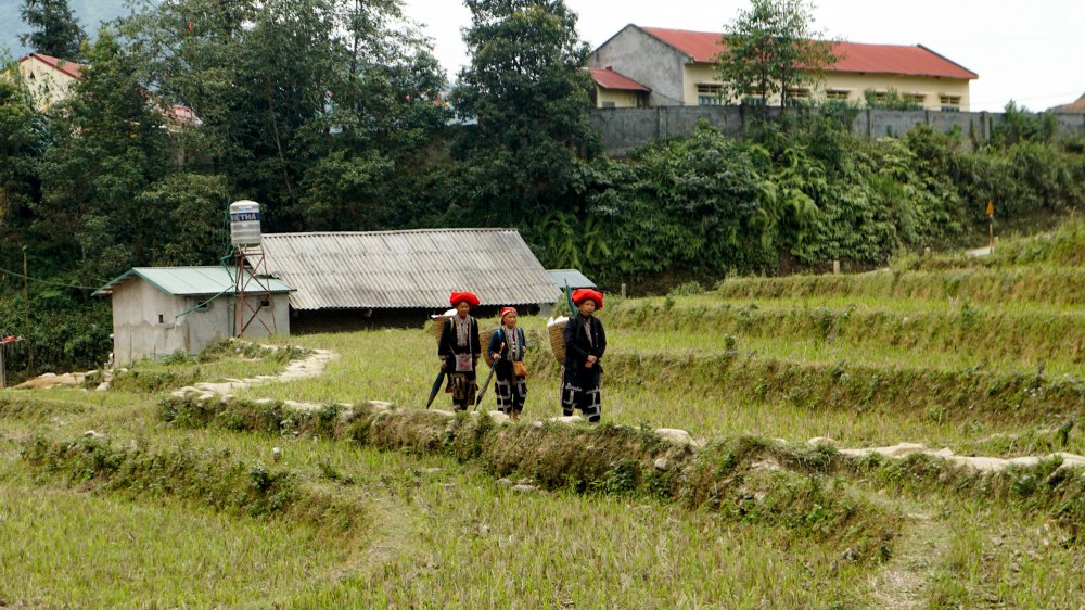 La brume se lève à peine lorsque nous quittons Sapa et offre de jolis panoramas tout au long de la randonnée. Nous croisons en chemin les habitants habillés de leurs costumes traditionnels typiques de leur minorité, Hmongs et Dao rouges.