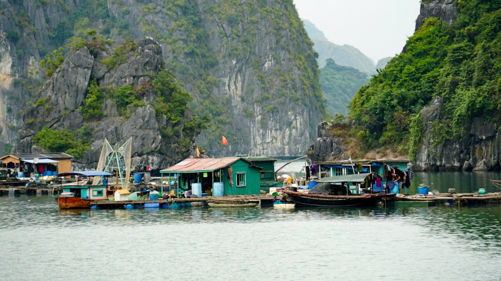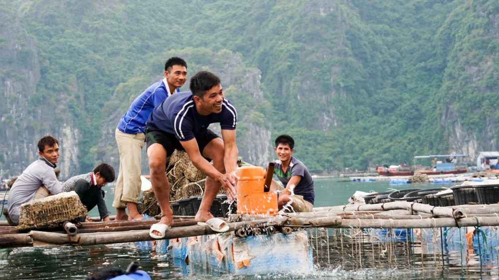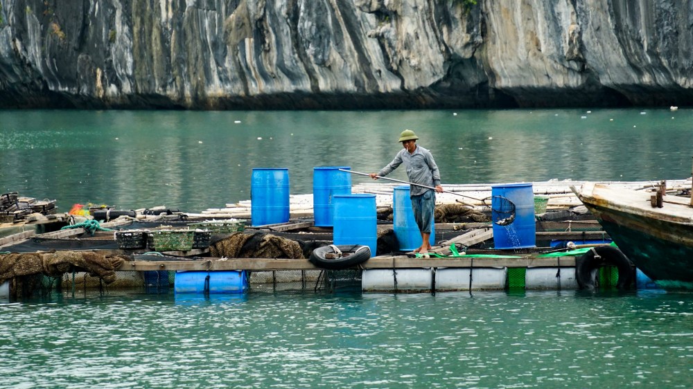 Dans cette baie, la réglementation locale autorise les maisons flottantes. Nous passons à proximité de plusieurs d’entre elles, couplées à des parcs à huîtres, ou fermes piscicoles et assistons aux scènes de travail quotidien.