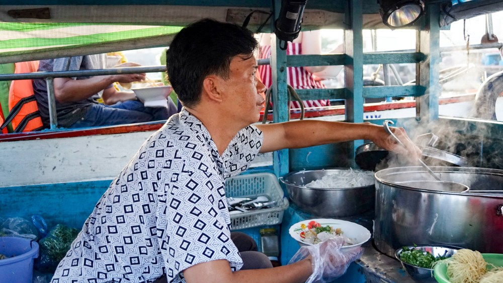De plus petites embarcations viennent soit s’approvisionner en produits qui seront vendus dans les marchés de détail de la région, soit vendre des boissons et soupes. Nous approchons l’un d’eux afin de commander une soupe de nouilles en guise de petit-déjeuner et achetons des fruits auprès d’autres bateaux.