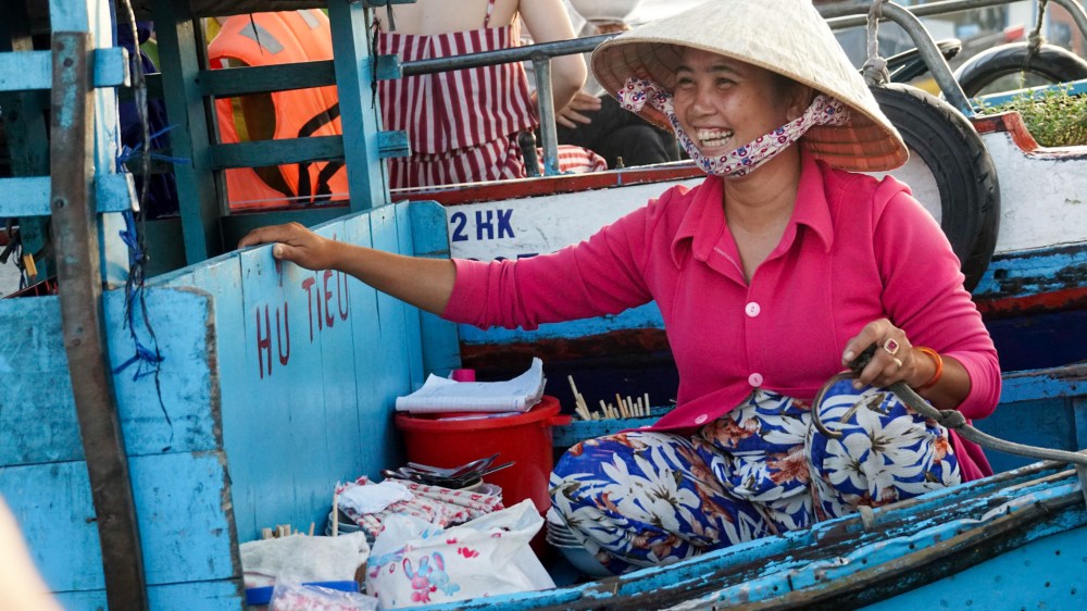 L’aurore se lève à peine lorsque nous embarquons sur le petit bateau de pêcheur qui va nous y conduire. Le Mekong après avoir pris sa source en Chine, traversé la Birmanie, la Thaïlande, le Laos et le Cambodge arrive enfin au Vietnam où il se sépare en 9 branches. La route qui vient de Saïgon en traverse deux impressionnantes par leur taille, mais notre bateau emprunte une branche transversale où se situe le marché.