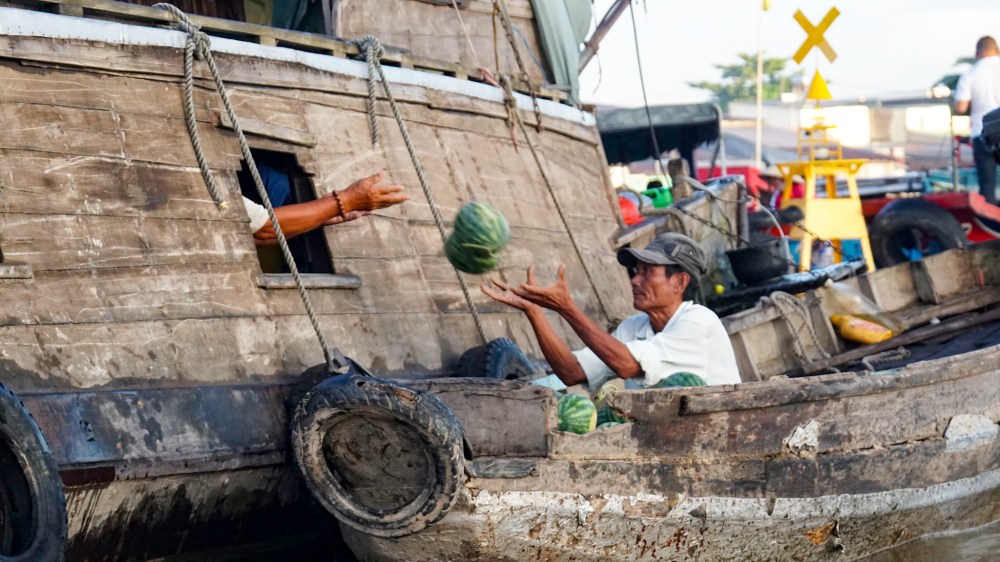 Le marché de Cai Rang est un marché de gros où des bateaux venant d’un peu partout dans la région se rassemblent pour vendre fruits et légumes. Pour savoir quelles marchandises sont vendues, les produits sont accrochés au sommet d’une tige en bambou dressée sur le pont et les bateaux se rassemblent par catégorie.
