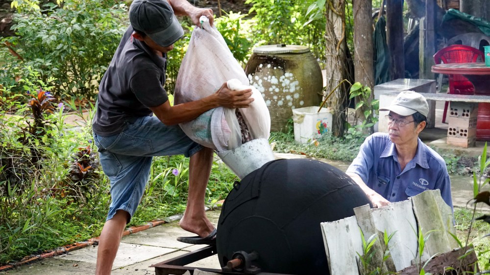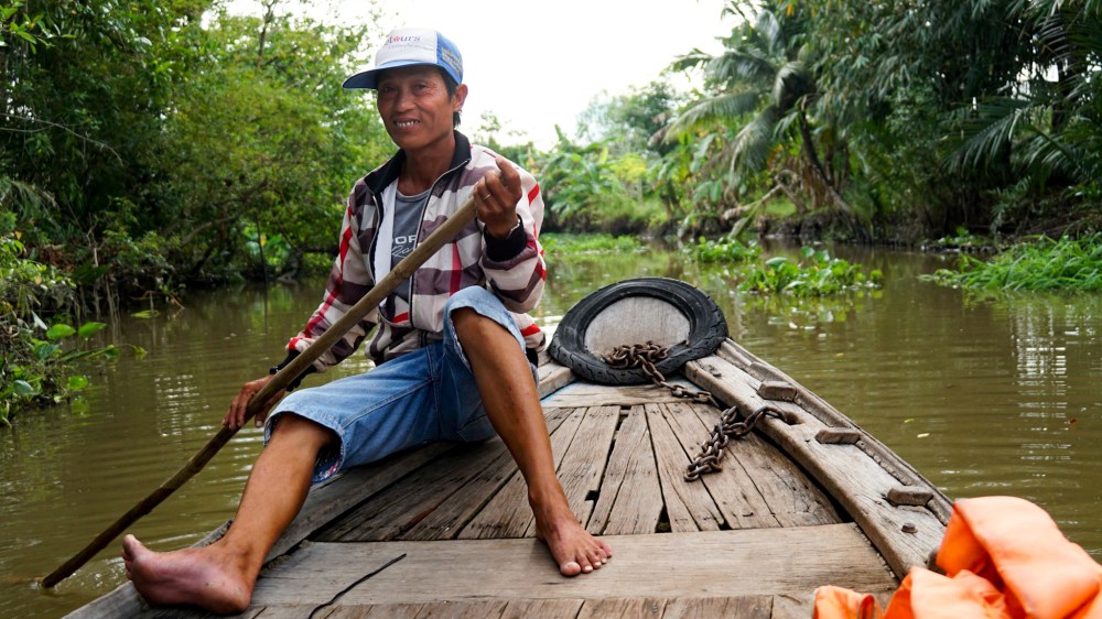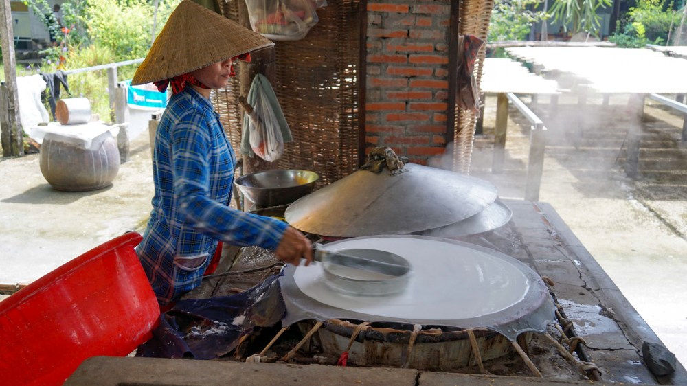 Notre bateau quitte enfin le bras transversal du fleuve pour parcourir les petits canaux qui sillonnent la campagne. Notre visite nous conduit jusqu’à une exploitation de cacao où le producteur nous présente son travail et fait déguster boissons chocolatées et cidre de cacao faits maison. En milieu de journée nous concluons par la visite d’une fabrique de nouilles de riz où nous goûtons une « pizza » dont la pâte est constituée uniquement de nouilles frites…